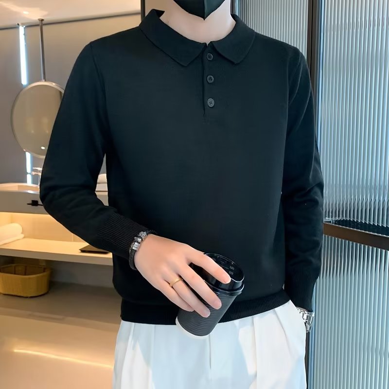 Poloシャツの軽い熟風の純色の襟の長袖のニットの男性の秋の韓国のファッションのゆったりしている内は底のセーターを掛けます。