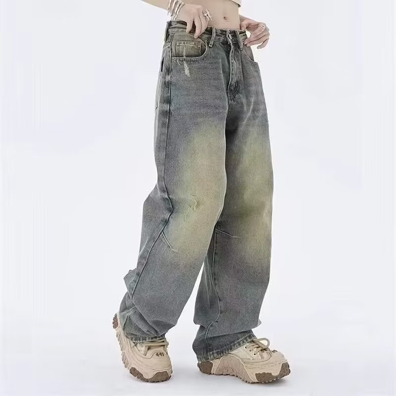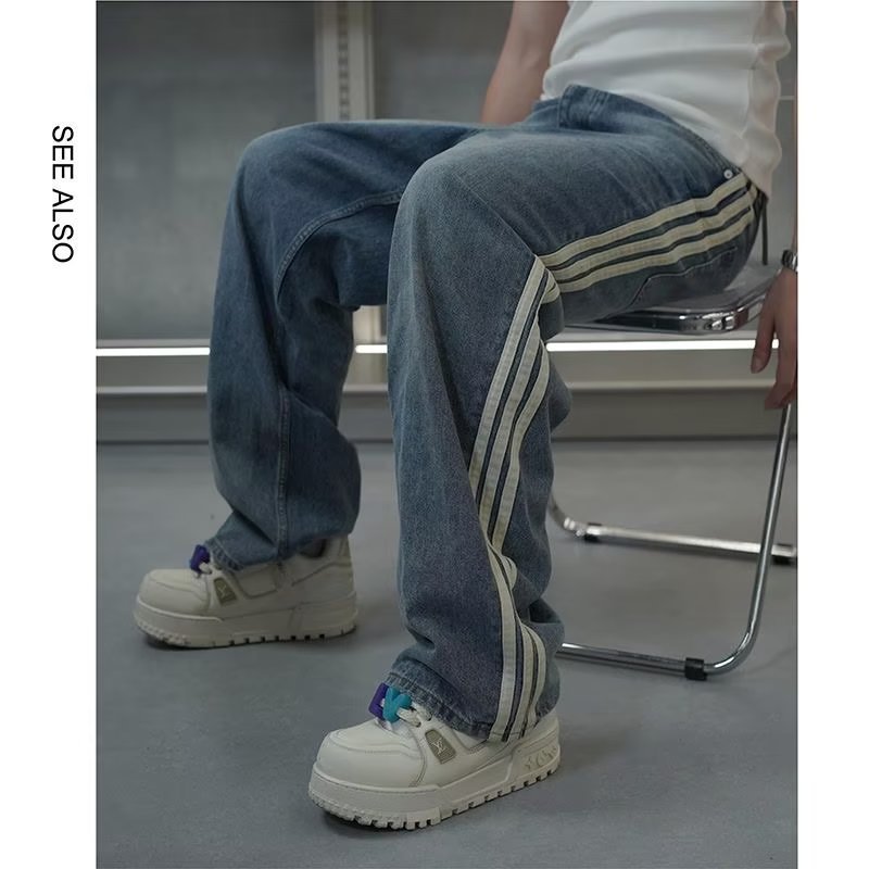 ファッションブランドのアメリカ式高街レトロな水洗いストライプのストレートジーンズ