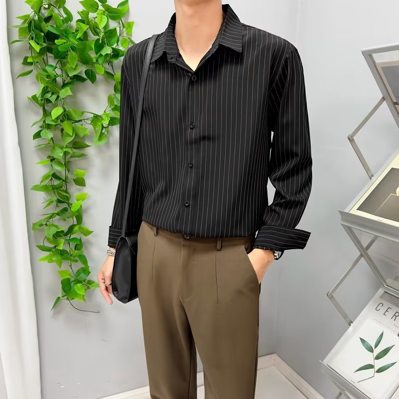 春秋高級感黒ストライプシャツメンズ長袖ビジネスカジュアルシャツ