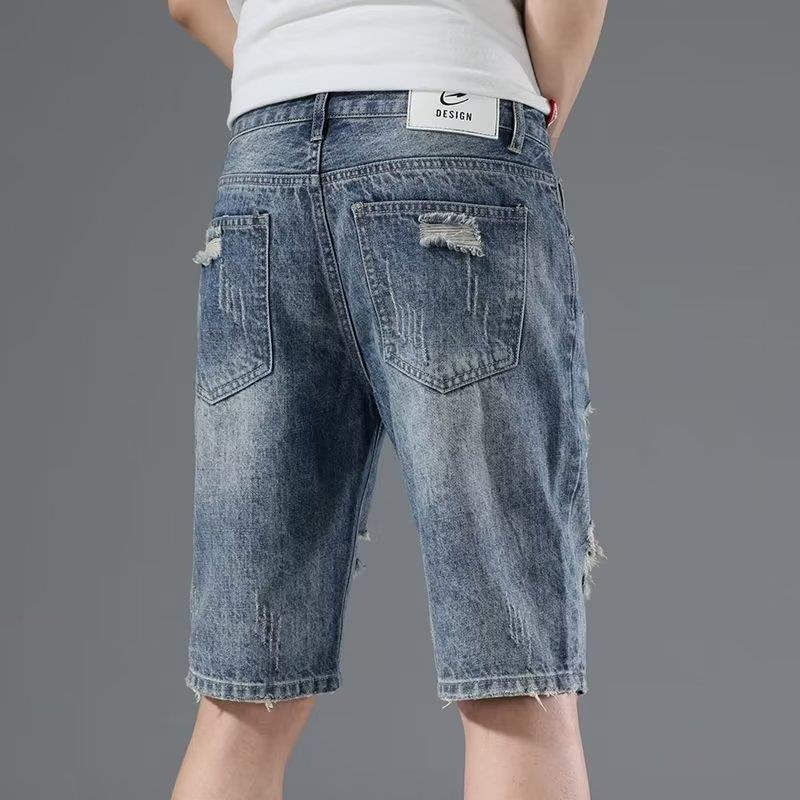 穴が開いているデニムの半ズボンの男性の夏の薄いタイプのゆったりしたストレートの5分のズボンのファッションのブランドのins男性のカジュアルな5分のズボン