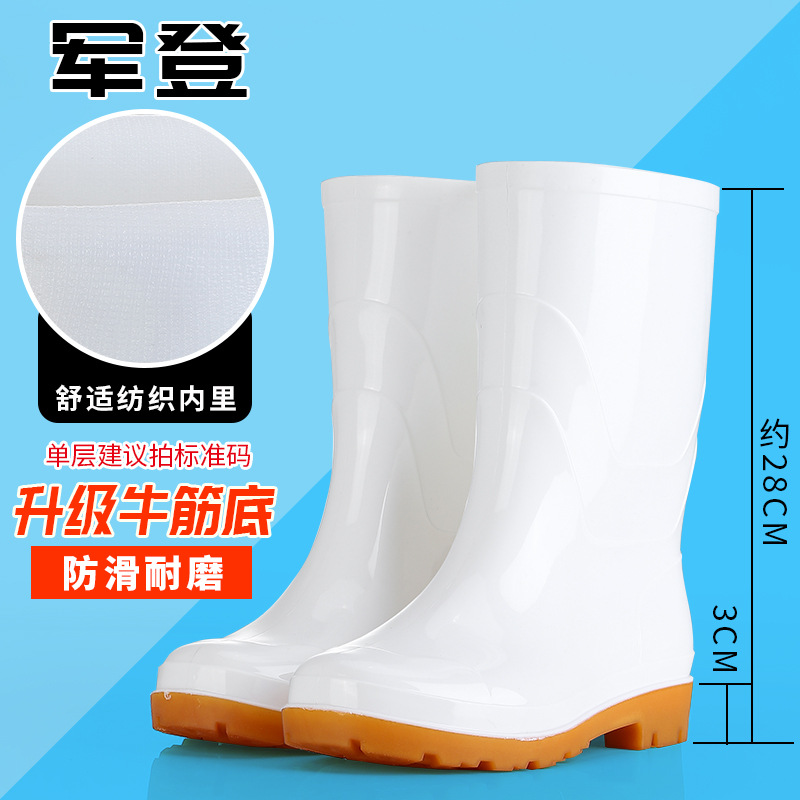 白いゴム靴、レインブーツ、ロゴ入りミッドチューブ、滑り止め労働保護ブーツ、男性と女性の食品工場作業場のウォーターシューズ、作業靴