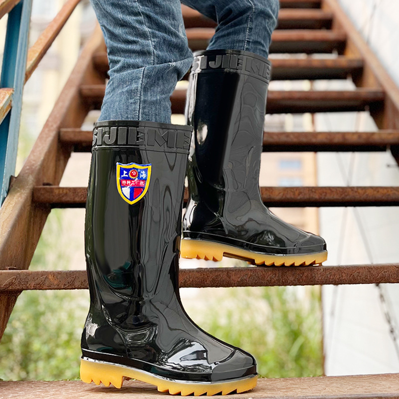 春と秋の雨の日の屋外着用用の黒のメンズハイトップレインブーツ防水性と滑り止めのオールインワンメンズウォーターシューズ建設用男性労働保護ゴム靴