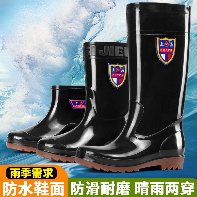 男女兼用ミリタリーハイチューブレインブーツ、シールドロゴ労働保護レインブーツ、ロングチューブブラック腱底ウォーターシューズ、ミディアムおよびショートチューブ滑り止めウォーターブーツ