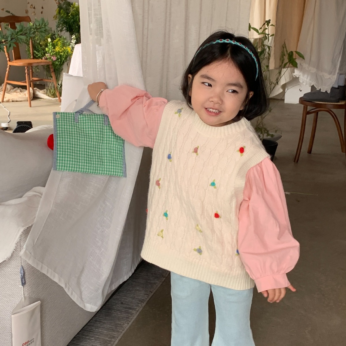 子供のニットウェアのレ抱擁2024春の新商品の爆発的な女の子の韓系の小さい花のプルオーバーの袖なしのニットウェア