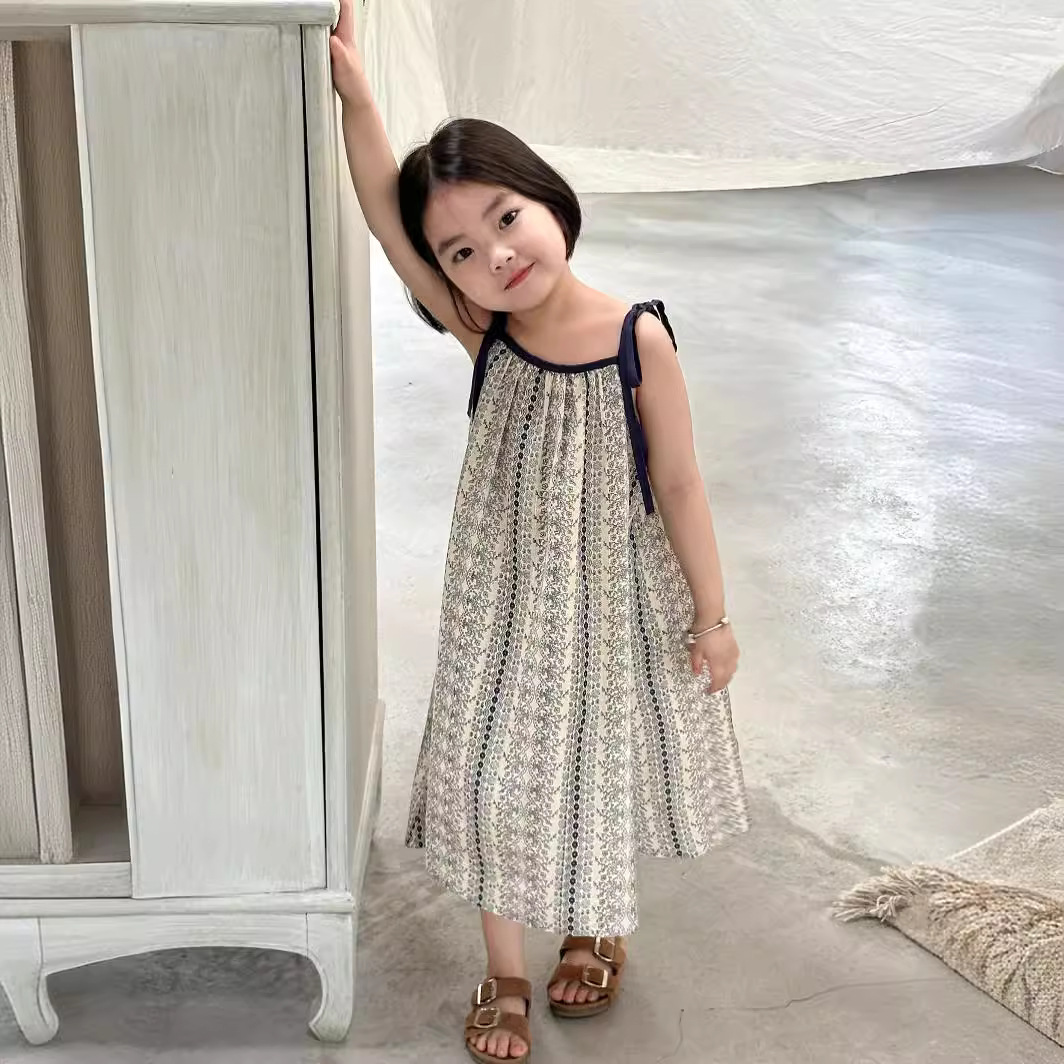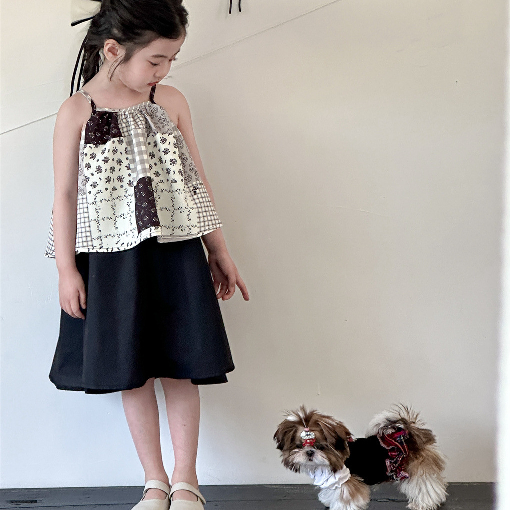 2025夏の新型の女の子の韓国版のデザイン感のレトロな森系の花のつなぎ合わせの綿布のa字のスカートのサスペンダーのスカート