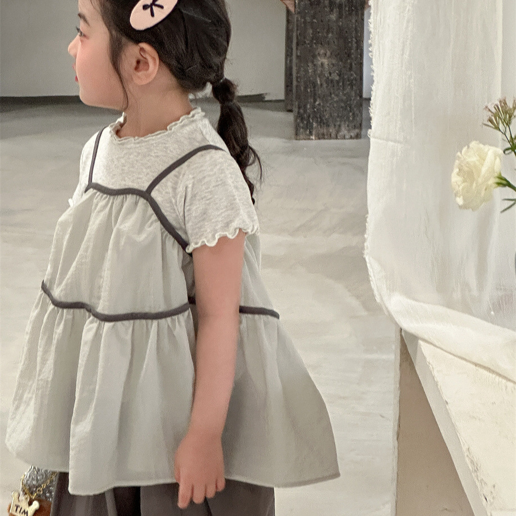 子供服のレ抱っこ2025春の新商品韓国の子供服の韓国版のかわいいゆったりとしたレースの女の子の上着をつなぎ合わせます。