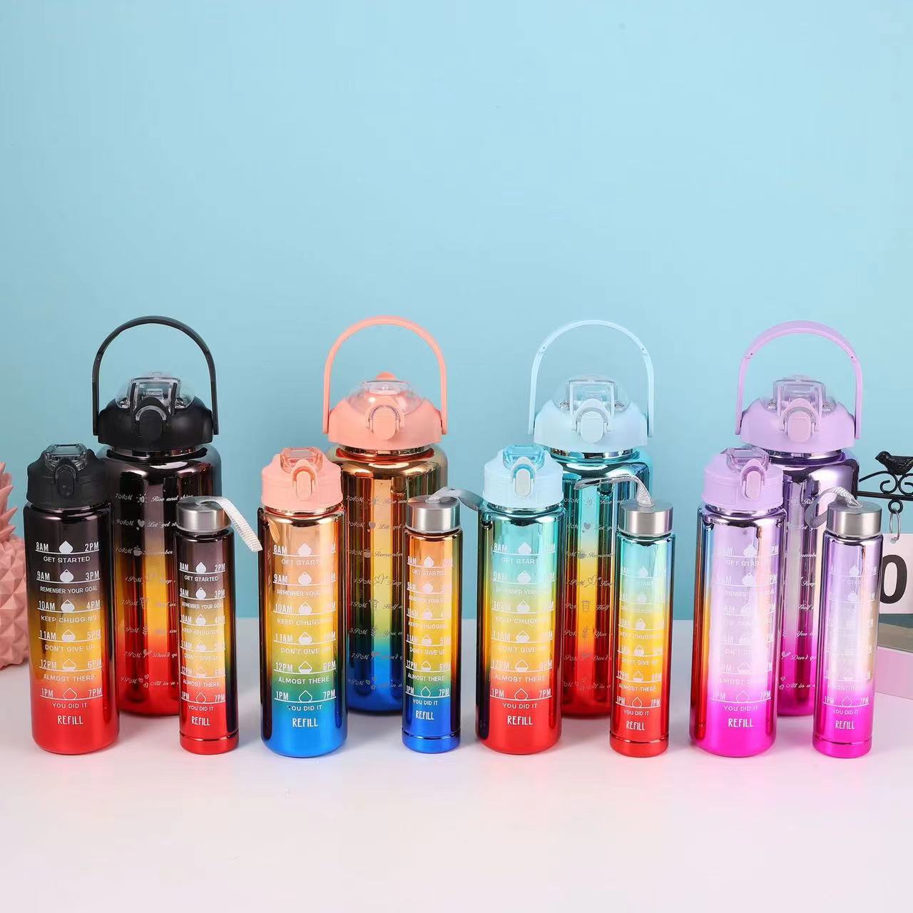 メーカーは国境を越えたプラスチックカップの電気メッキ三セットの大容量運動水筒を供給して、三色の自慢の水筒を持っている