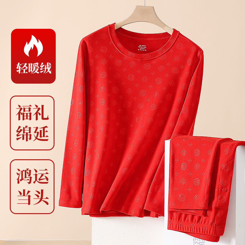 本命年保温下着男性セット徳絨毛厚いエンボス福字赤加肥大サイズ女性秋衣秋ズボン