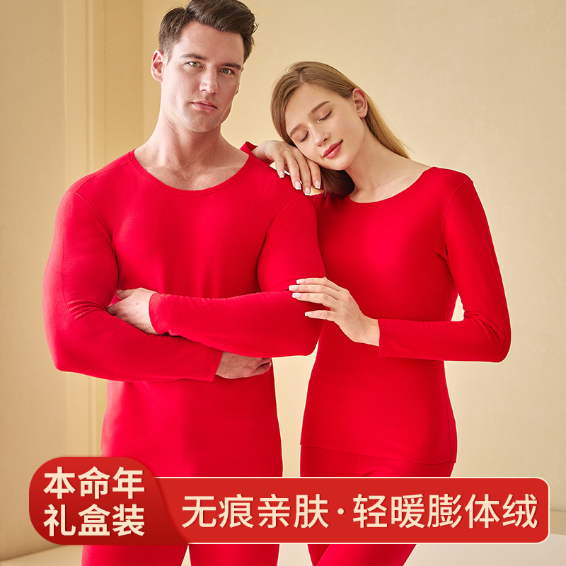 2025本命年依翡翠徳絨毛大赤色保温下着男性スーツ蛇年結婚女性秋衣秋ズボン