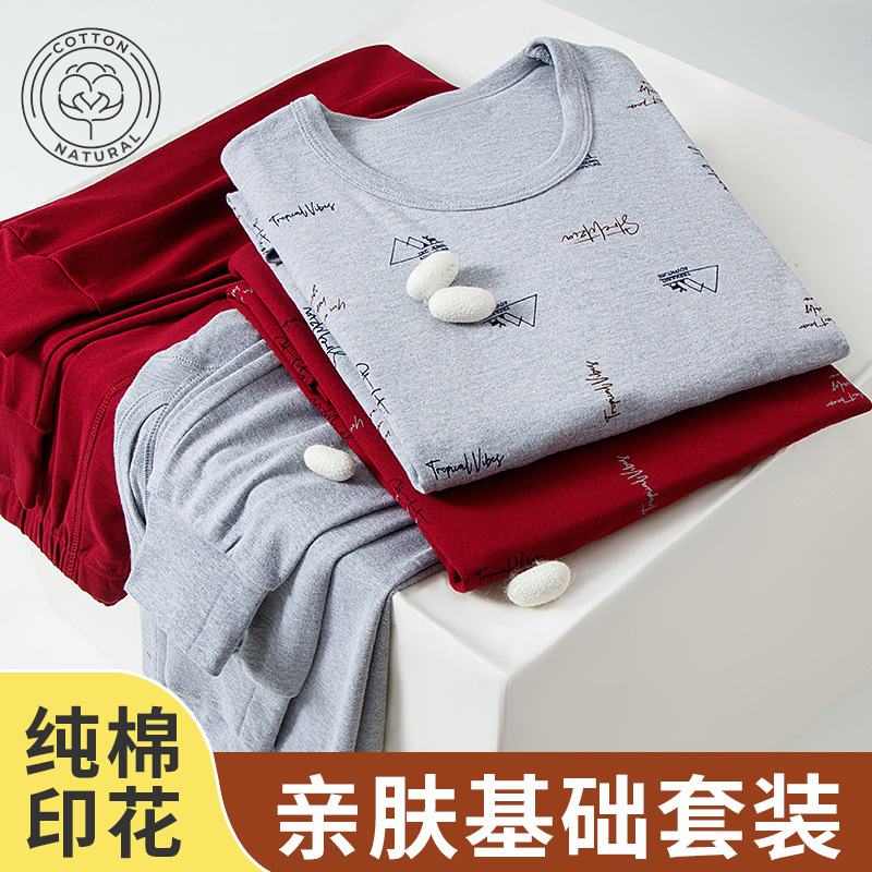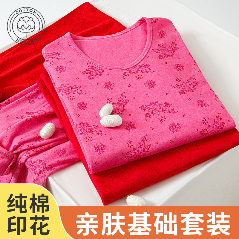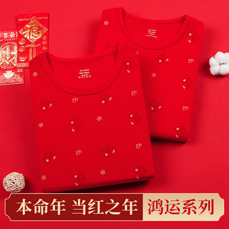 【平安福】本命年秋衣秋ズボン男性セットライカ綿ジャカード赤色福字女性保温下着