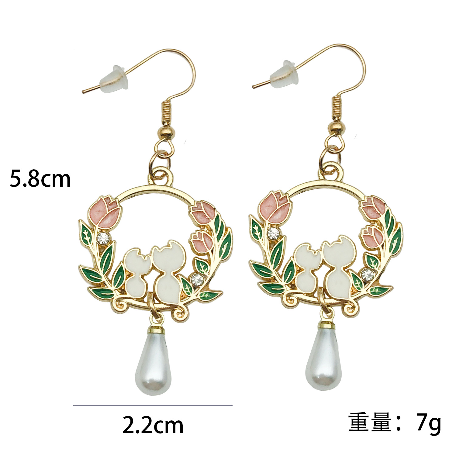 カップルの猫の透かし彫りの花の真珠のイヤリングのかわいい動物のペンダントのアイデアの耳のフックの親友の金の速売は国境を越えます。