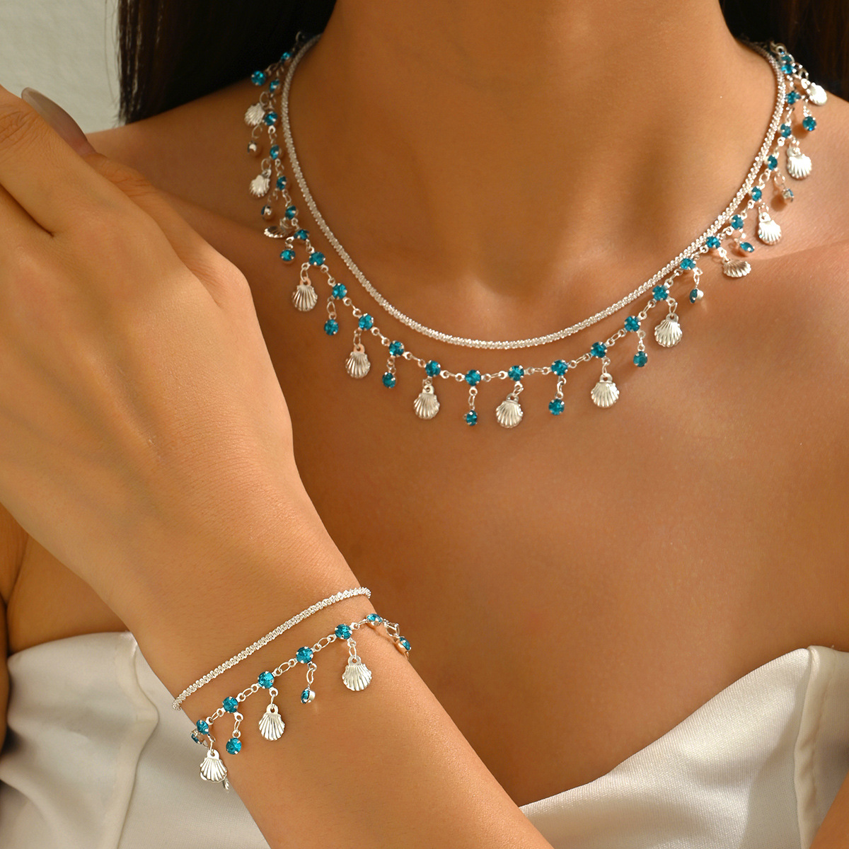 クロスボーダー新しいスタイルボヘミアンマーメイドプリンセスブルーダイヤモンドシェルタッセルスタッキングネックレスブレスレットライトラグジュアリーセット