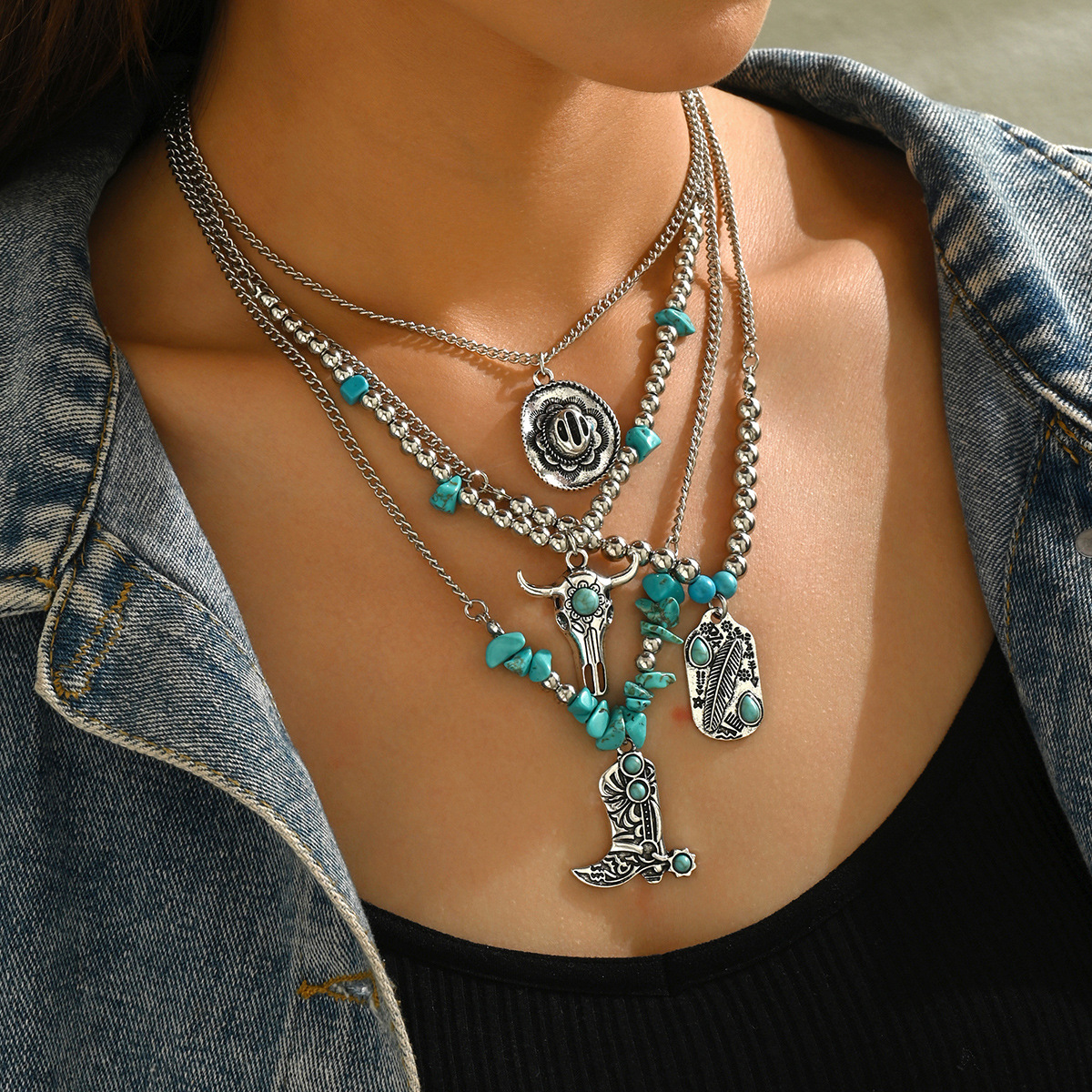 ヨーロッパとアメリカのクロスボーダーパーソナライズされたレトロな模造ターコイズ牛頭鎖骨チェーンエスニックスタイル手作りビーズサボテンカウボーイハットスタック