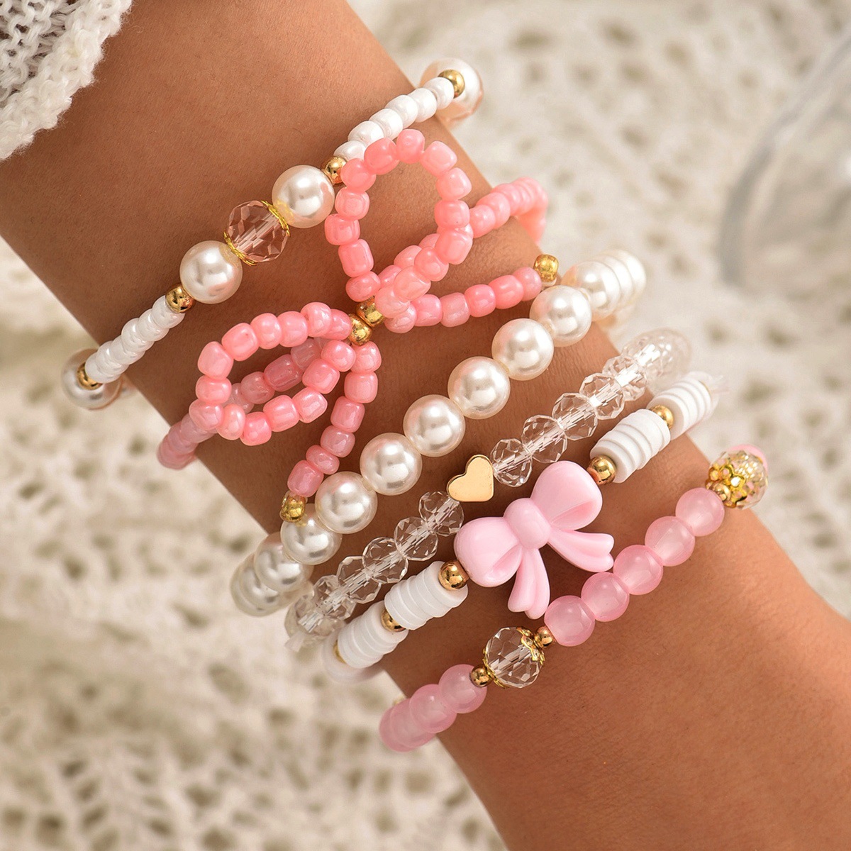 国境を越えた人気のブレスレット6点セット、甘くてかわいいガラス模造パール手作りビーズピンクリボンブレスレットセット