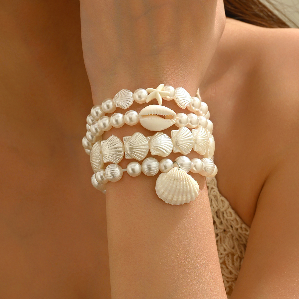 欧米の越境した夏の海辺の休暇の天然の貝殻のサザエの真珠の数珠の弾力性のレジャーの砂浜の手は女性を飾ります。