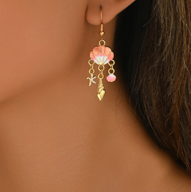 ヨーロッパとアメリカのボヘミアンオーシャンスタイル合金グラデーションカラーコンクホタテヒトデタッセルイヤリング気質クリエイティブイヤリング