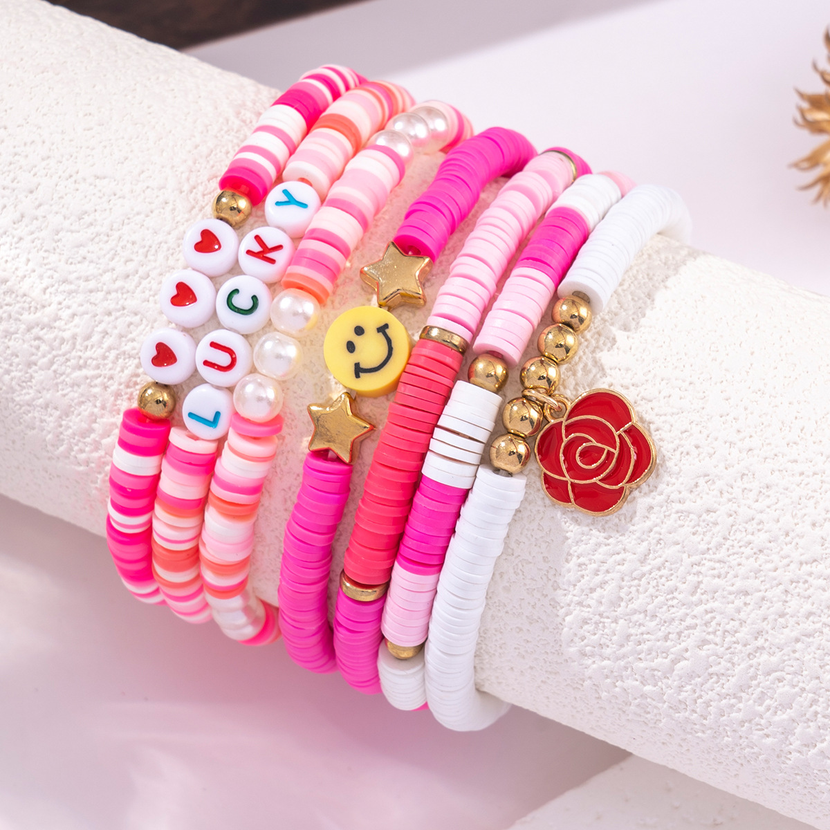 ヨーロッパとアメリカの国境を越えた売れ筋多層弾性糸ソフトクレイラブスマイリーフェイスブレスレットセットビーズフラワーブレスレットラッキー