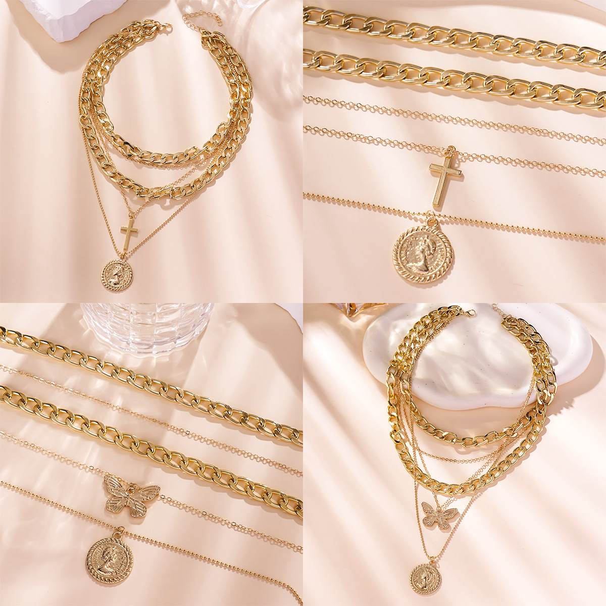 欧米のクロスボーダーのレトロな多層はアルミニウムの鎖の合金の硬貨の十字の蝶のペンダントのネックレスの太いチェーンをかぶせます。