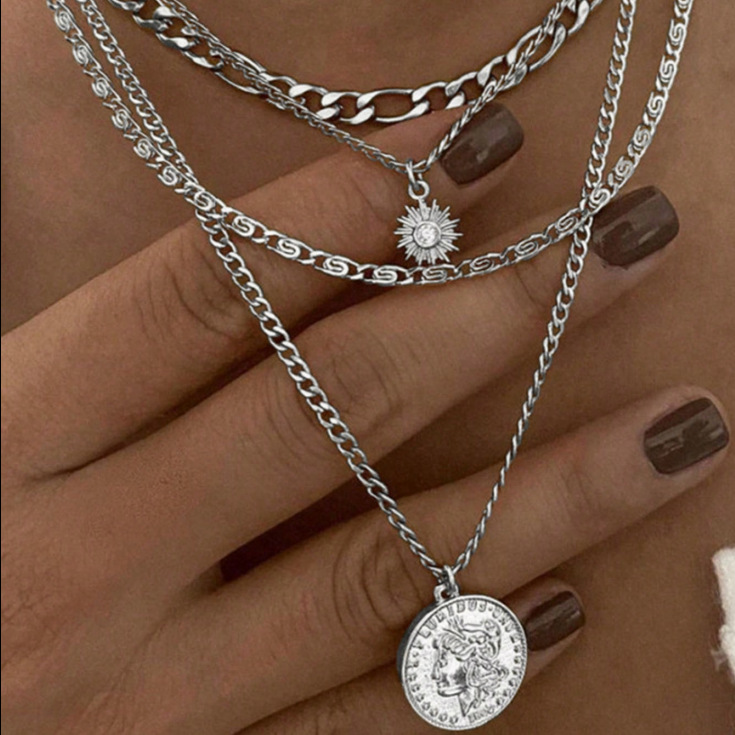欧米の国境を越えた人気パンク風金属誇張チェーン人像コインペンダント多層ネックレス女性