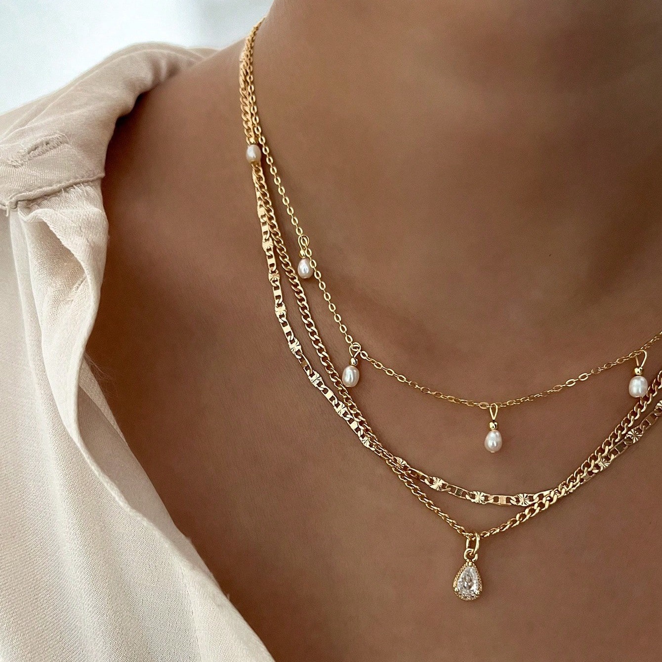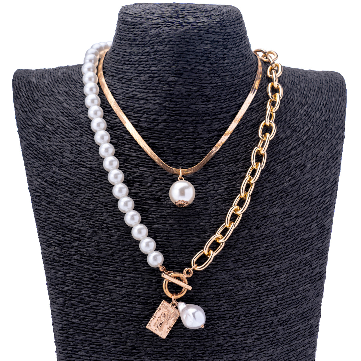 欧米のクロスボーダーの人気ファッションのレトロな多層は真珠の水滴のペンダントの金色の玉のネックレスの女性を模倣して重ねてつけます。