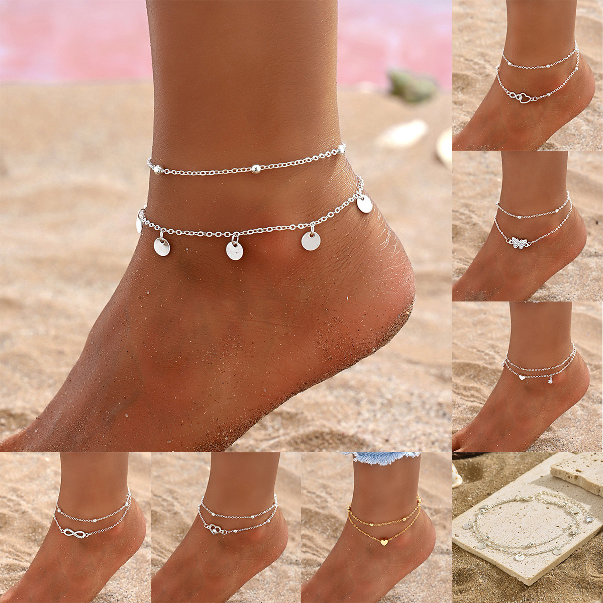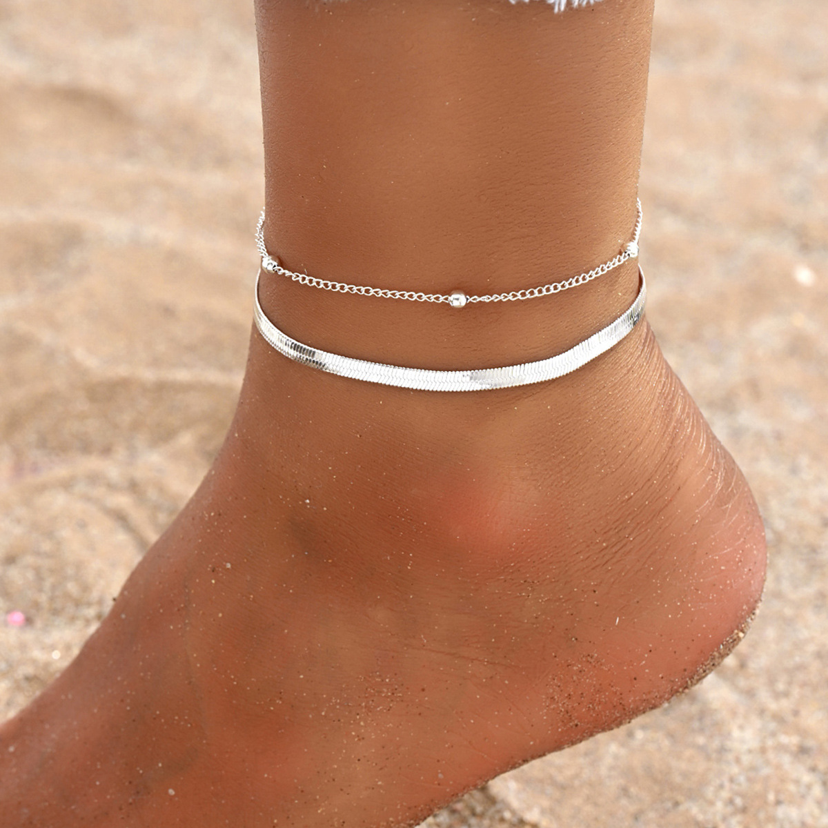 1ピース欧米ファッションins风金色扁蛇チェーン二重転送ビーズ足チェーンレディース二重ビーチフットチェーン