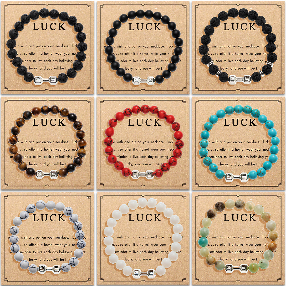 1本の個性的なダンベルの部品の石のブレスレットの黒色のすり石の手作りのビーズはカードの箱があります。