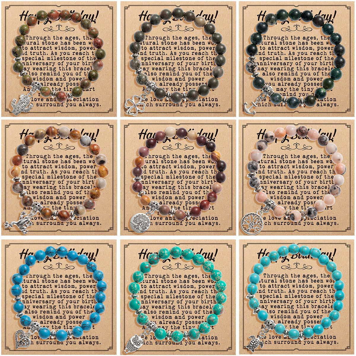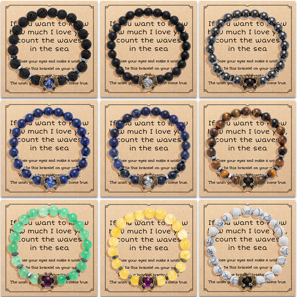 1本の石のブレスレットの合金の王冠の黒色のすり石の松石の手作りの数珠はカードの祝福の言葉を持ちます。