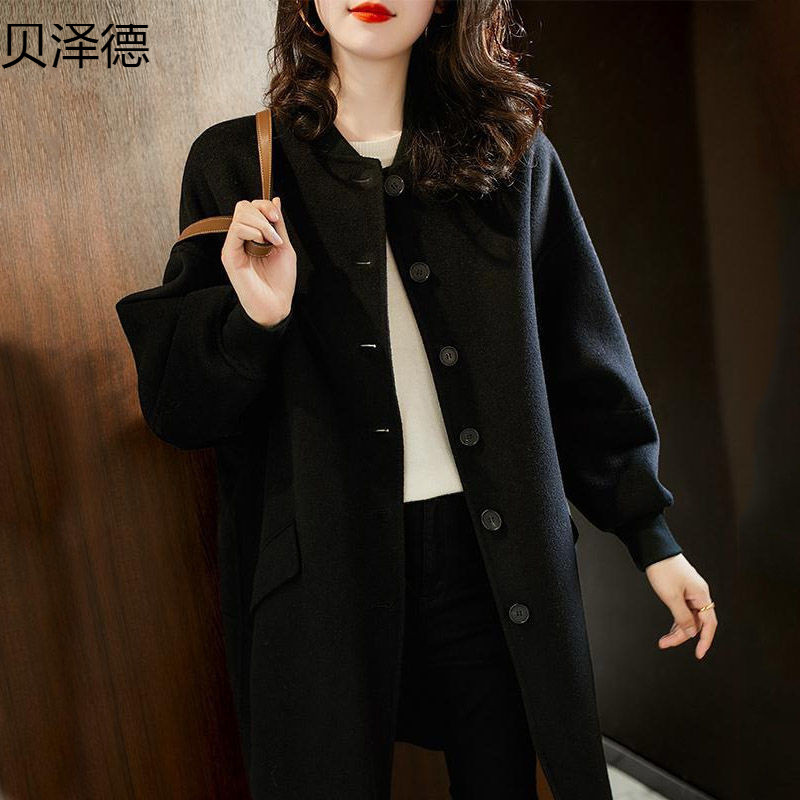 黒い毛のコートの女性の秋の新型の洋気の中で長いタイプの修身はやせていてカジュアルな百合のラシャの大きい貝を現します。
