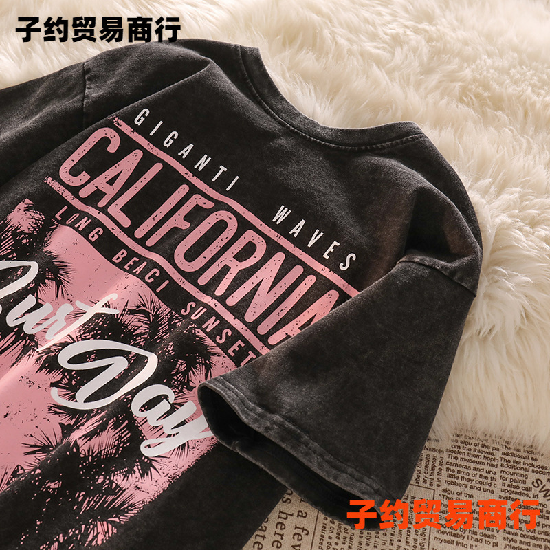 アメリカのレトロな古い半袖のシャツの女性の夏のゆったりしたデザイン感の小さい大衆の水洗いの黒い丸首の上着