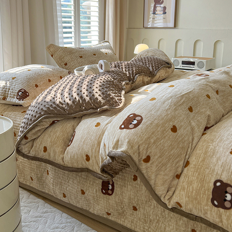 牛乳のベルベットのベッドカバー4点セット冬の豆の単品カバーが厚くて暖かい枕カバー3点セット