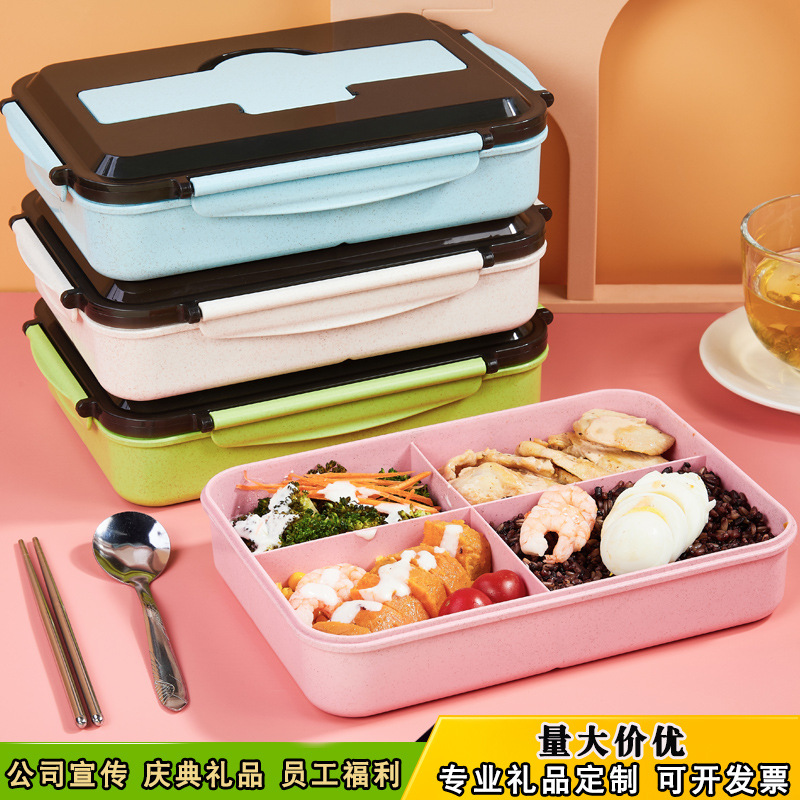 小麦わら四格弁当箱プラスチック弁当箱蓋付き電子レンジ1500mlランチボックス卸売りプレゼントロゴ
