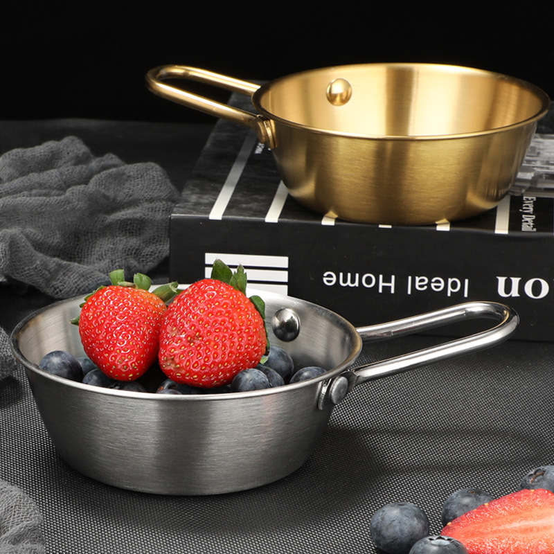 304ステンレスの米酒の碗の韓国式料理店のホテルの調味料の碗は取っ手の金色の創意の食器の小さい黄色の碗を持ちます。