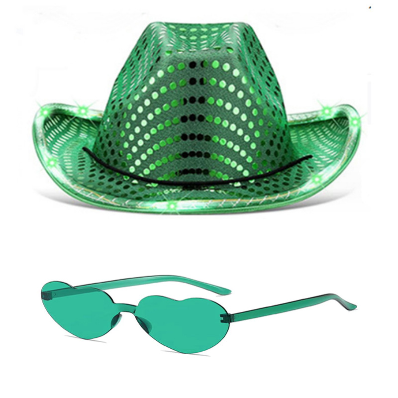 在庫あり アイリッシュ パーティー グリーン ライト付き スパンコール カウボーイ ハット メガネ セット 聖パトリックの日 グリーン カウボーイ ハット