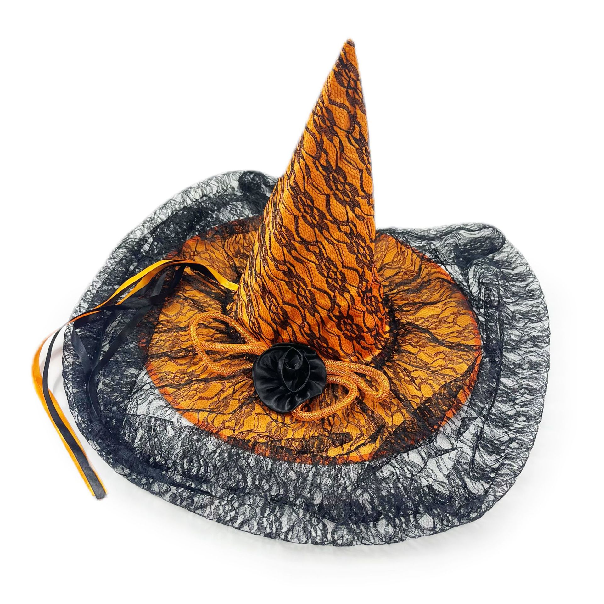 ハロウィンオレンジメッシュスパイダーウェブ魔女帽子ライト付きウィザードハット花ライト付きLED魔女帽子