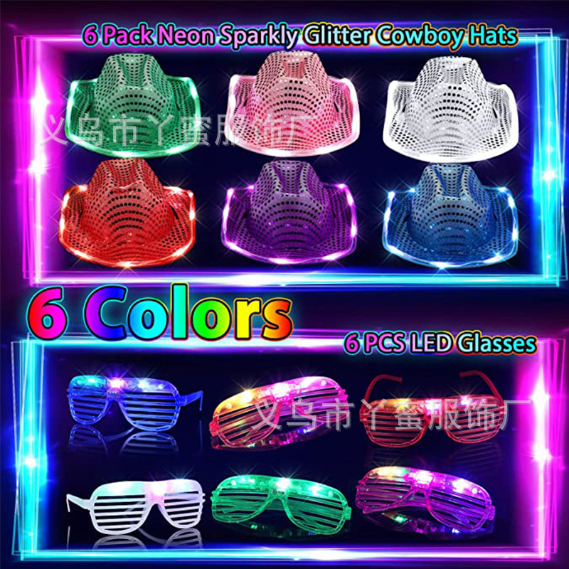 メーカー黒地に金色のスパンコール付きライト付きカウボーイハット、ライトブルーのスパンコール付きハット、ハロウィンスパンコール付きEVAカウボーイLEDハット