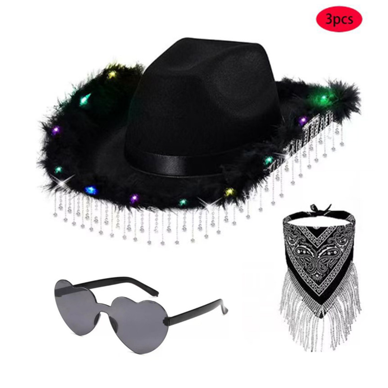 スポットブラックローエッジカラーライトショートラインストーンカウボーイハットメガネスカーフセットカーニバルガールライト付きカウボーイ