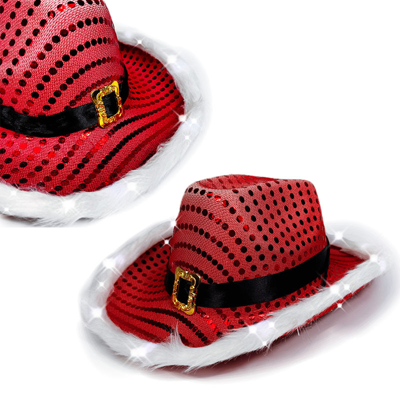 国境を越えた新商品の赤いスパンコール白灯カウボーイ帽サンタクロース黒リボン金ボタン帽子西部灯帽子