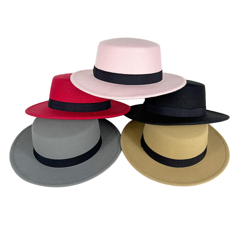スポットブラックフラットウールハット、フラットつばシルクハット、フェルトシェイプハット、トレンド秋冬ウールカウボーイハット