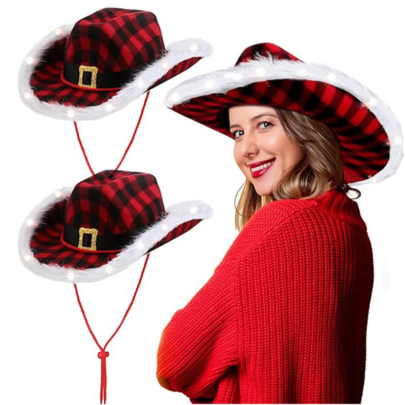 クリスマスフェザー黒と赤のチェック柄カウボーイハットメーカー西部カウボーイハットサンタ帽子ベルトカウボーイ