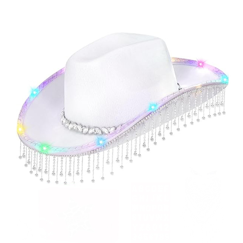 スポットホワイトマウスアイタッセルドリルストリップライト付きカウボーイハットホワイトウォータードロップドリルストリップラインストーンLEDカウボーイハット