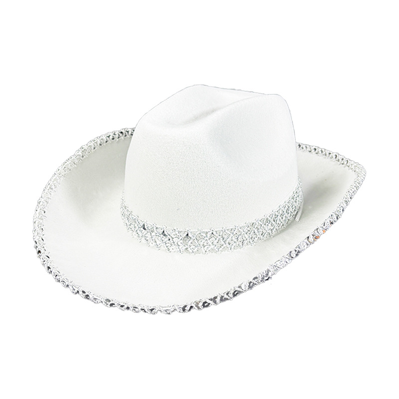 ホワイトダブルレーススパンコールカウボーイハットピンクウエスタンカウボーイハットフラワーリムスタイリングハットスパンコールリムカウボーイハット