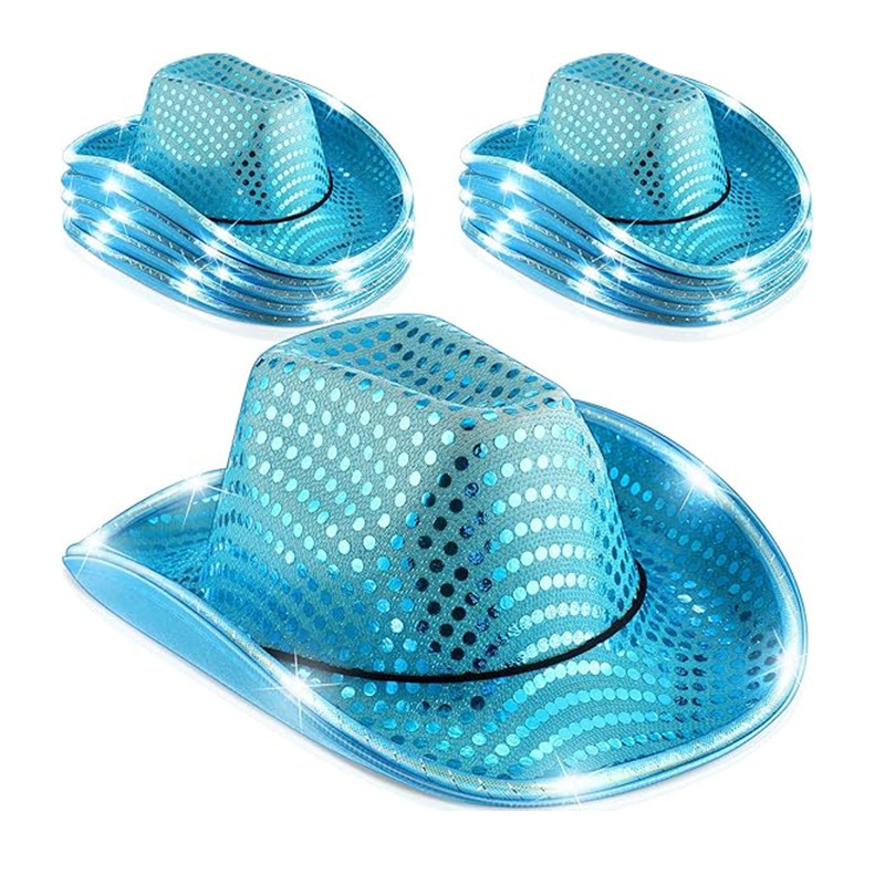 ハロウィン ライトブルー スパンコール付きライト付きカウボーイハット ブルースパンコール ネットチューブライト LED ライト付きカウボーイハット