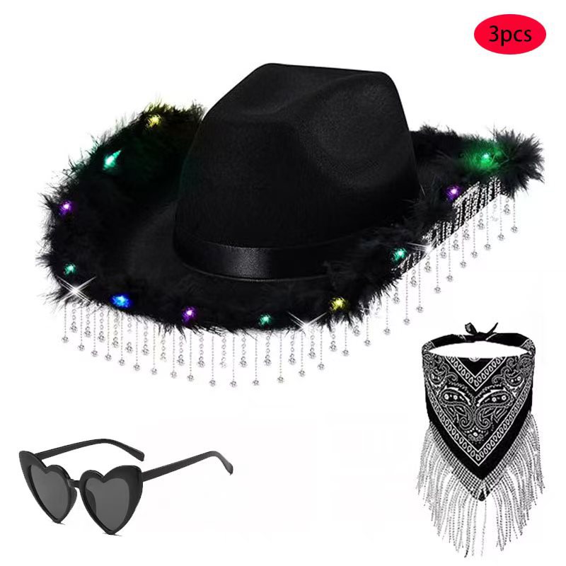 黒のローエッジカラーライトショートラインストーンカウボーイハットメガネスクエアスカーフセットカーニバルガールライト付きカウボーイハット