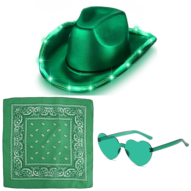 アイルランドパーティーグリーンブロンズ布ライト付きカウボーイハットメガネスクエアスカーフセットカーニバルライト付きカウボーイハット