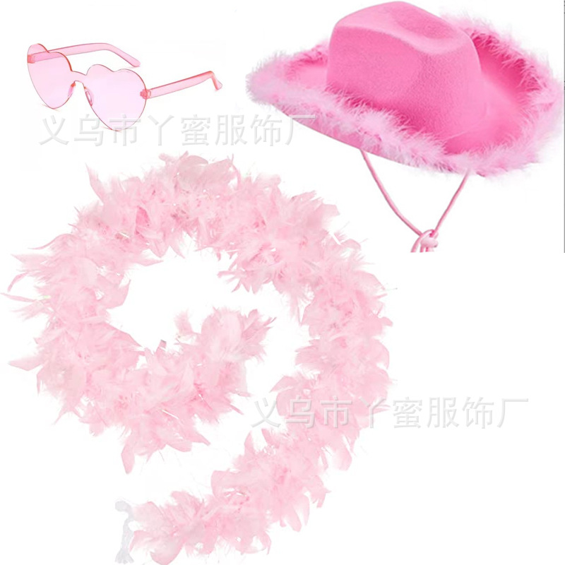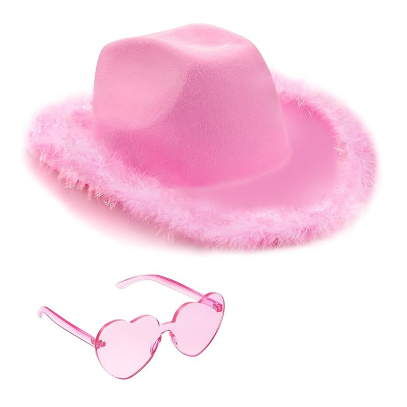 ピンクのローエッジカウボーイハットとピーチハートメガネのツーピースブラックとホワイトのミルクカウボーイハットとメガネのセット