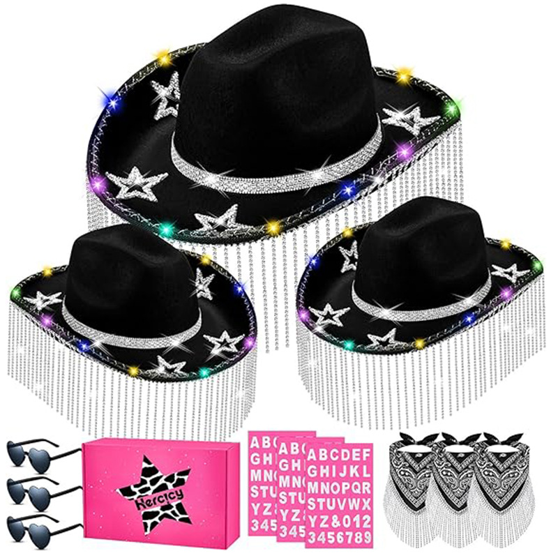 スポットブラックラインストーンタッセルライト付きカウボーイハットレイブパーティー用ラインストーンタッセル五芒星ライト付きカウボーイハット