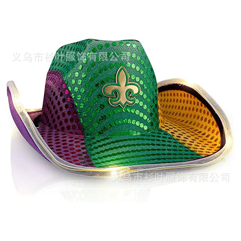 カーニバルスパンコール付きライト付きカウボーイハットグリーンとパープルのカラーマッチングウエスタンスタイルLEDライトマジックカラーコンポジットスタイリングLEDハット