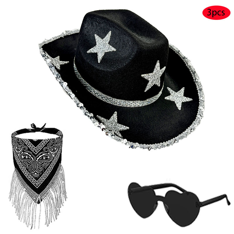 在庫あり ハロウィン ブラック 五芒星 カウボーイ ハット スクエア スカーフ メガネ セット ダイヤモンド付き 五芒星 ウエスタン カウボーイ ハット