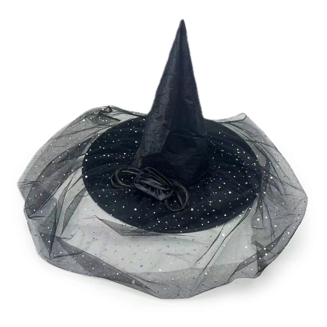 ハロウィンブラックメッシュ魔女帽子ライト付きオックスフォード布魔術帽子花ライト付きLED魔女帽子
