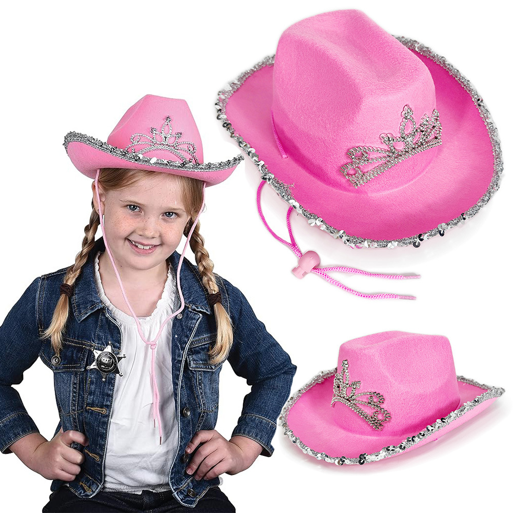 スポットピンク子供用シルバーエッジクラウンウエスタンカウボーイハットカーニバルパーティー子供用パフォーマンスハットバービーファッションハット